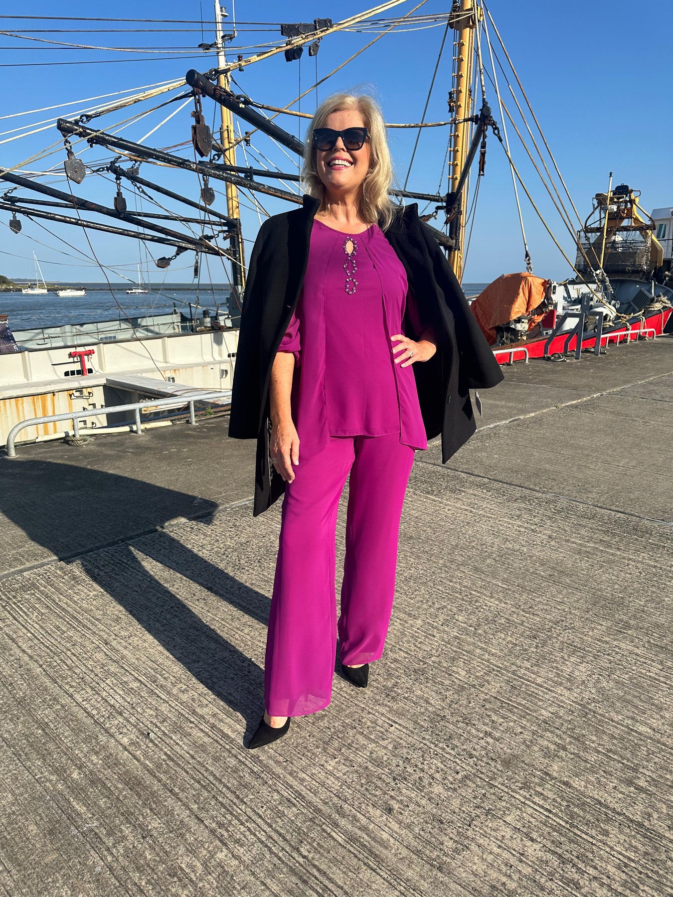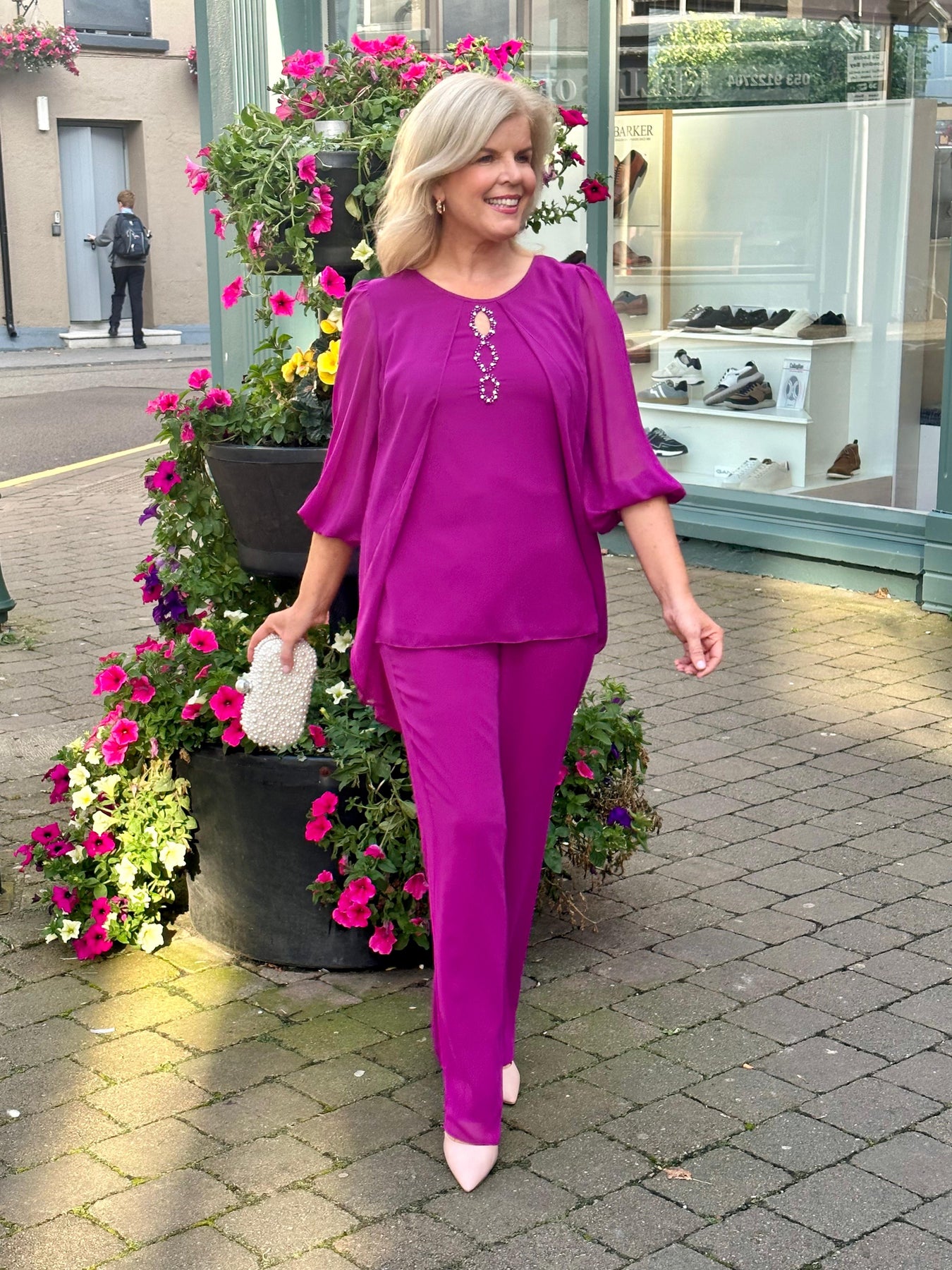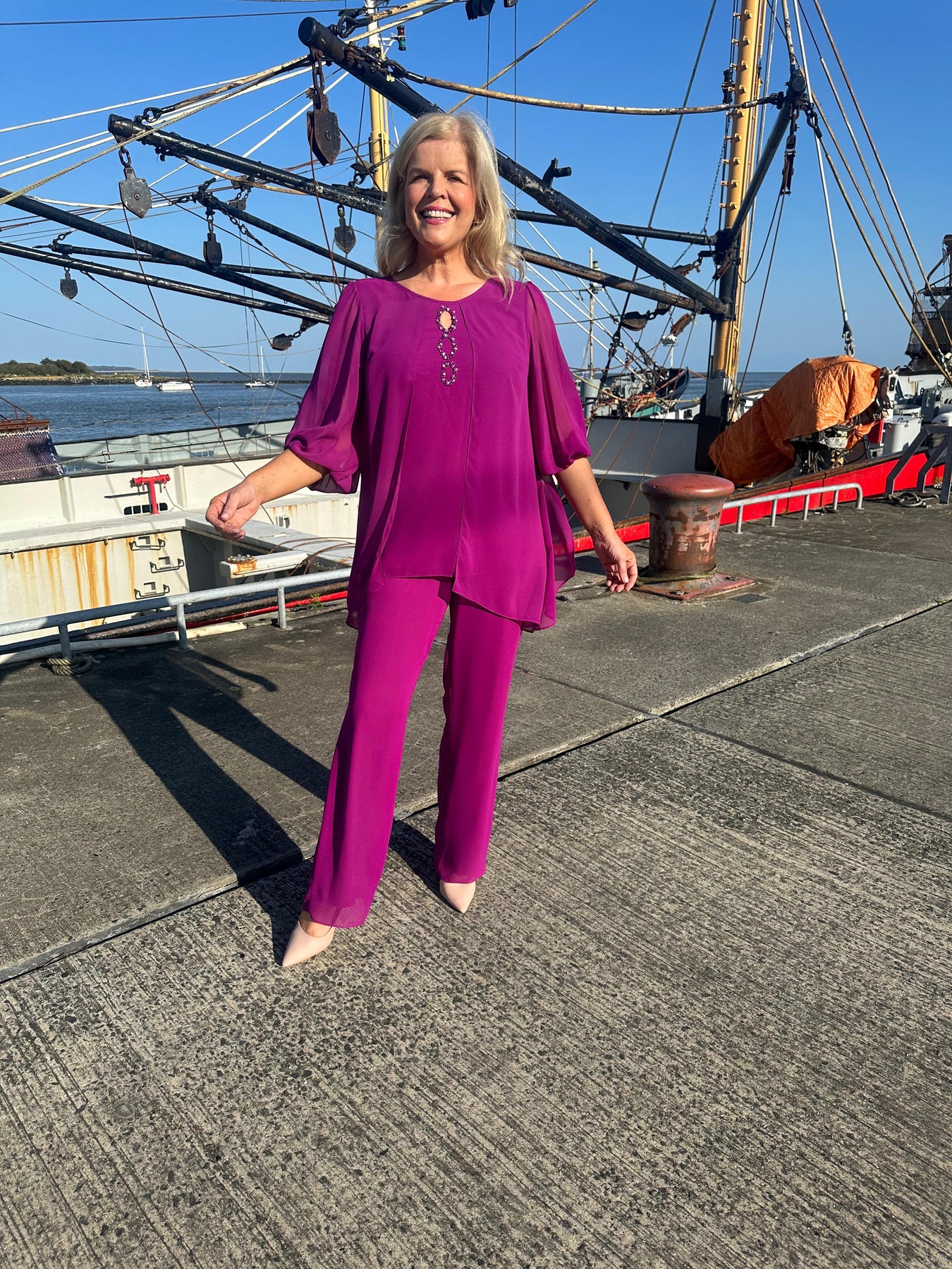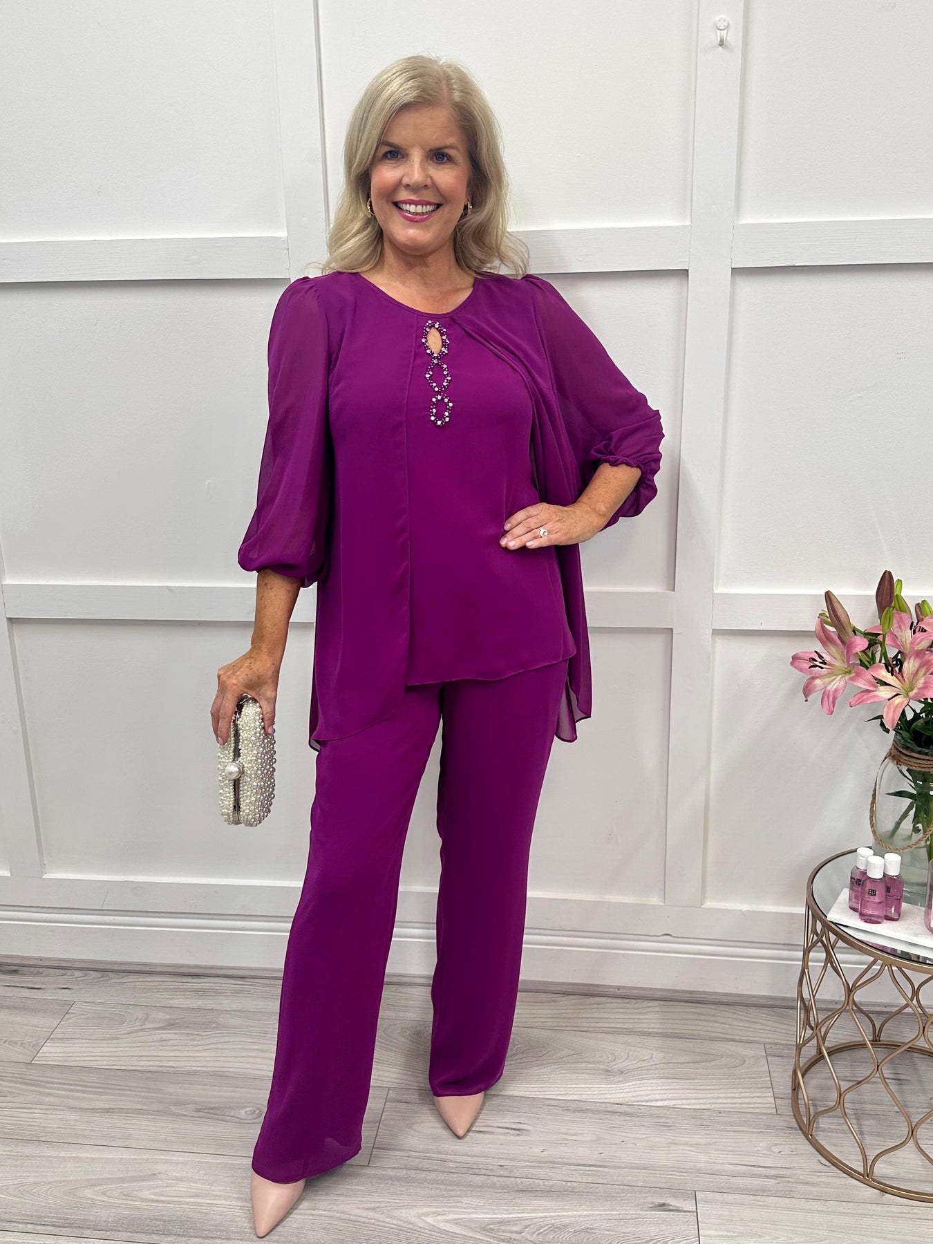 Embrace elegance in our lizabella ‘ Tatianna suit’ now available in Fushia. This beautiful 2 piece suit features a layered overlay for a flattering silhouette, with gentle embellishment . The top is lined with a sheer sleeve. Perfect for any occasion .