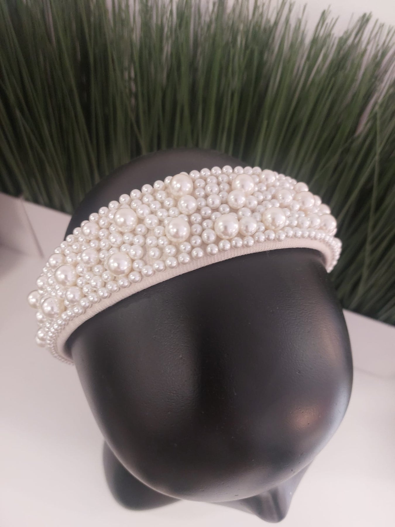 Add a touch of timeless elegance to your look with this beautifully crafted pearl headband. Designed on a softly padded base for comfortable all-day wear, it features layers of lustrous ivory pearls in varying sizes, creating a luxurious, textured finish.