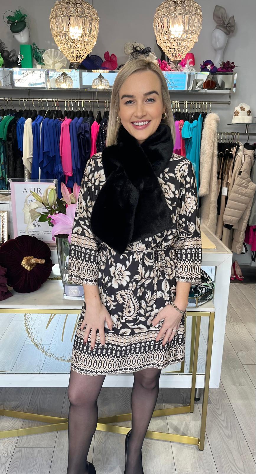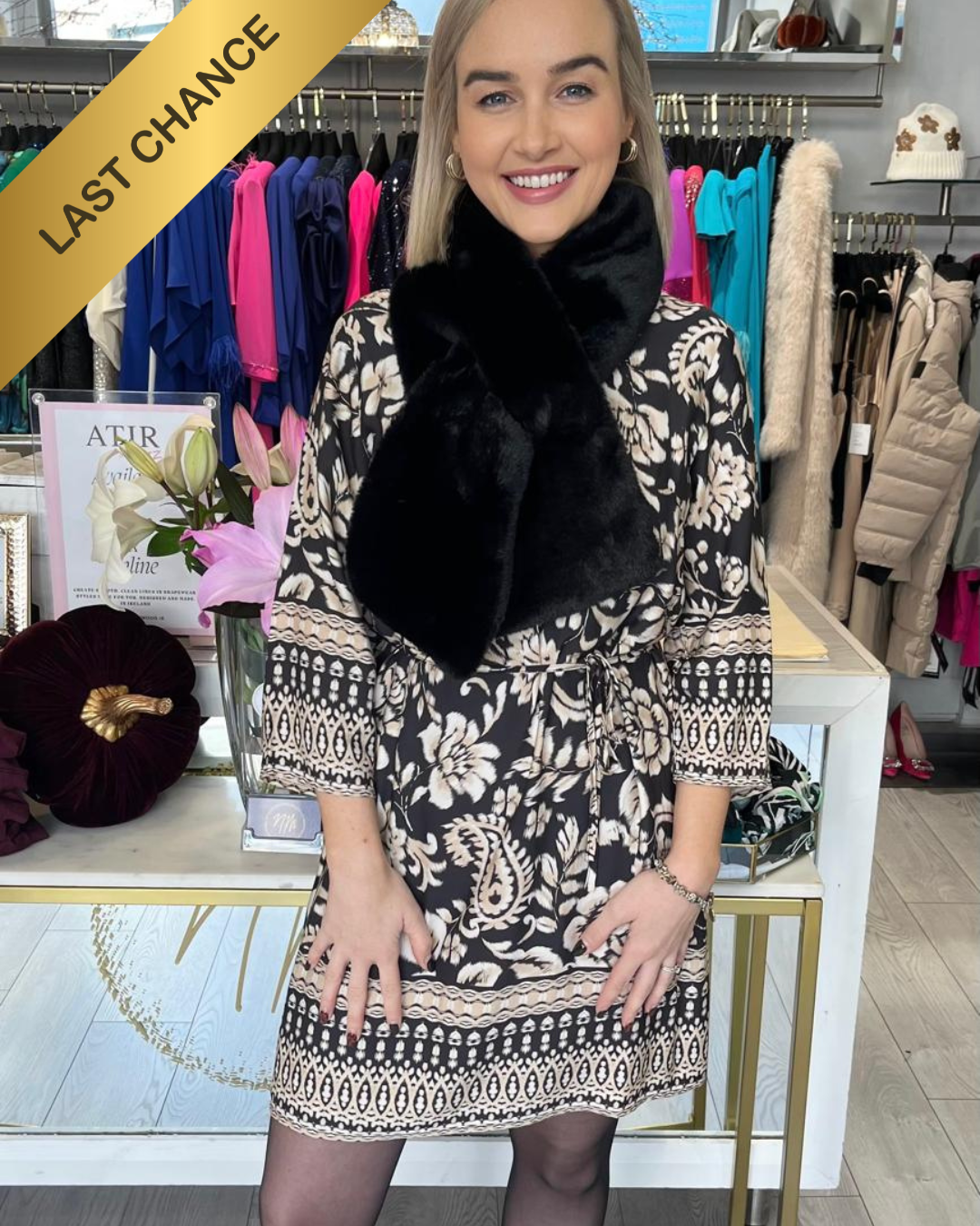 Short straight dress -3/4 sleeves -Wide round neckline -Belt to tie at the waist -Length from the shoulder 90cm for a size S