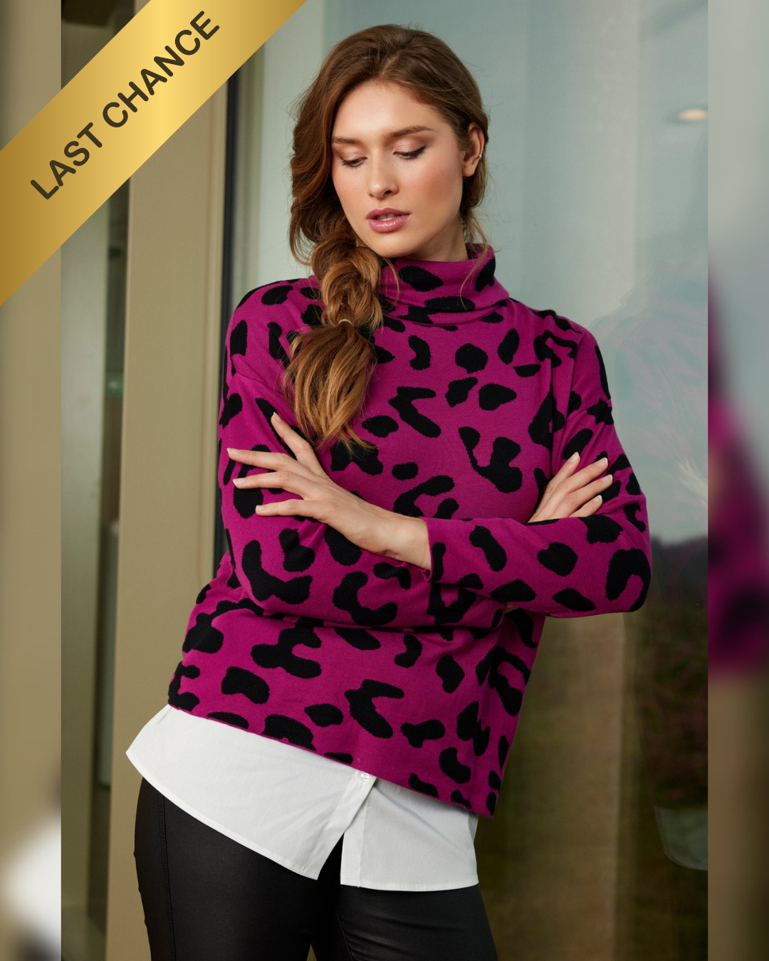 Make a statement with this eye- catching polo neck, featuring a vibrant pink base and black animal print. Crafted from a soft ,breathable blend of 55% acrylic and 45% cotton, it offers warmth without sacrificing comfort. Perfect for layering or wearing on its own for casual or dressier occasions .