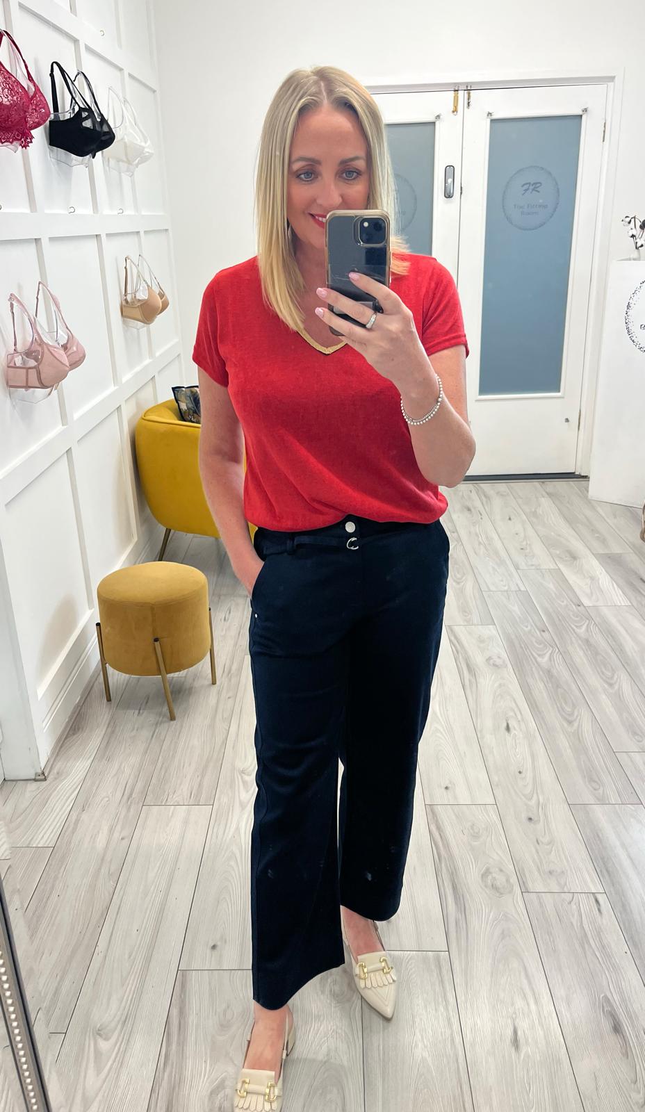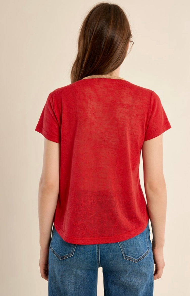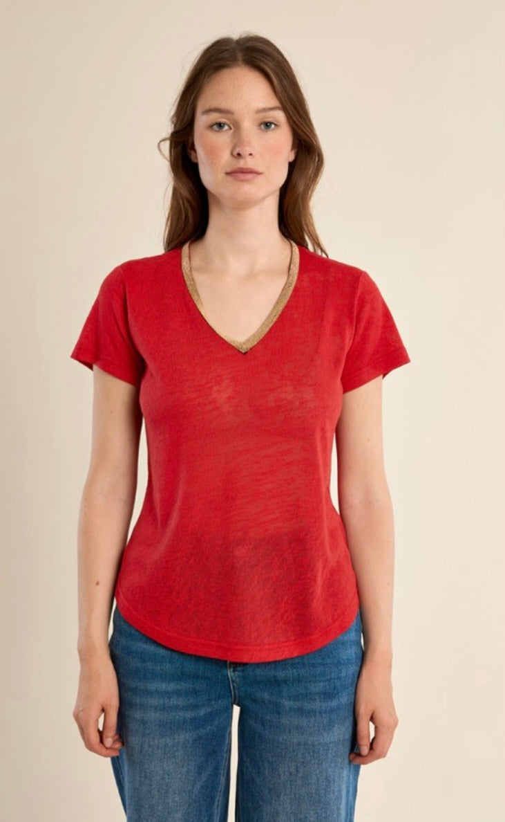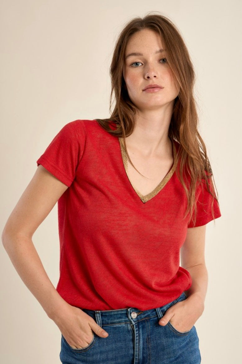 "-V-neck T-shirt, gold and red -Short sleeves -Semi-transparency -Length from the shoulder 62cm for a size S"