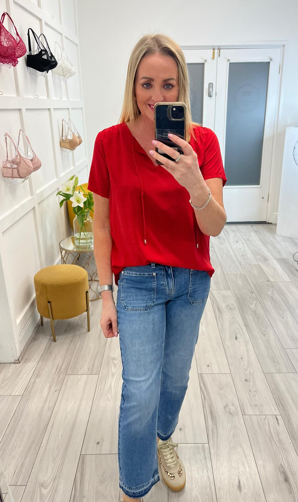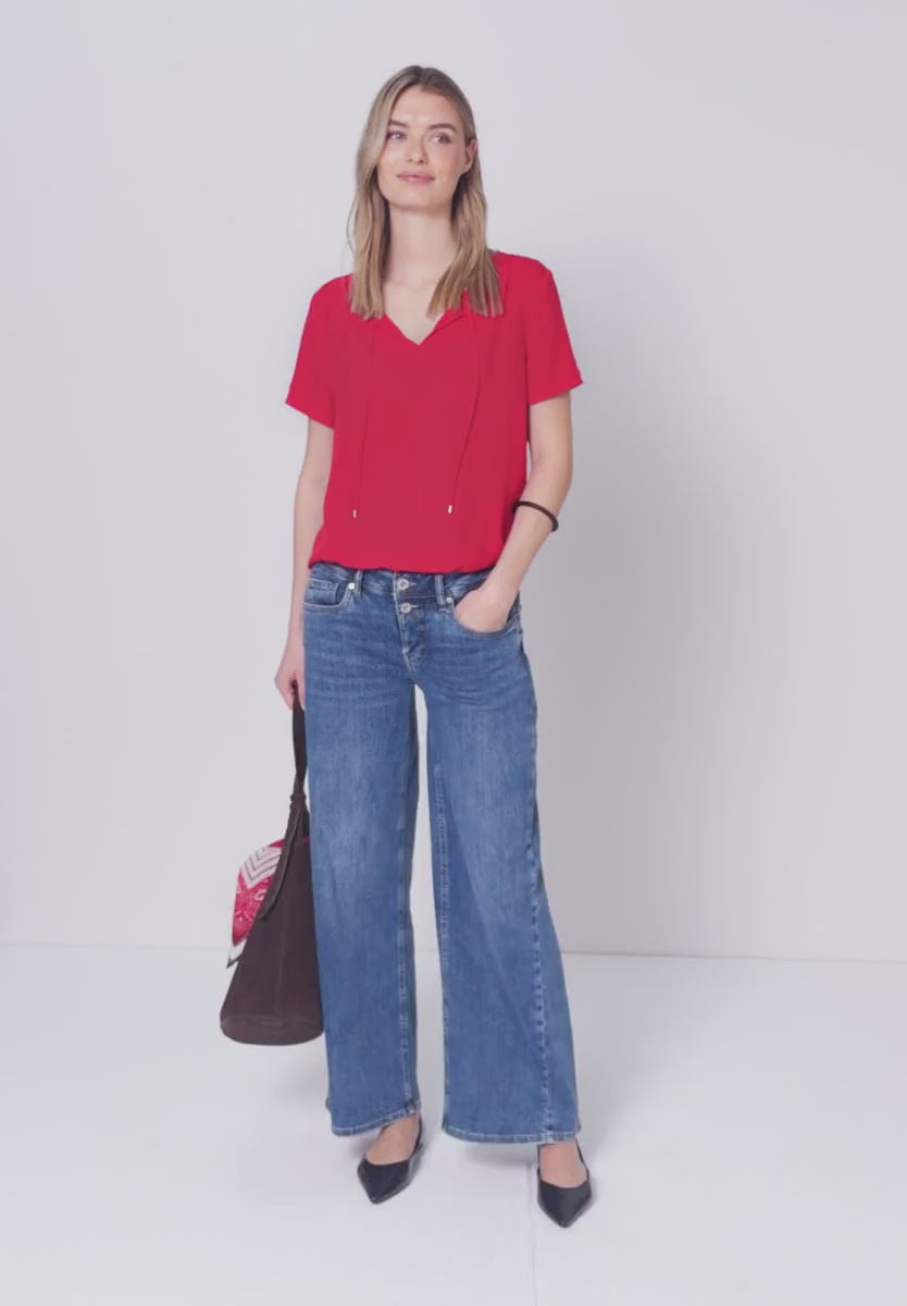 This solid-color blouse from Street One impresses with its clean design and a feminine string detail at the split neck. The soft viscose fabric drapes beautifully and feels comfortable against the skin. Side slits at the hem ensure breathability. A simple, versatile piece – ideal for everyday wear and leisure.