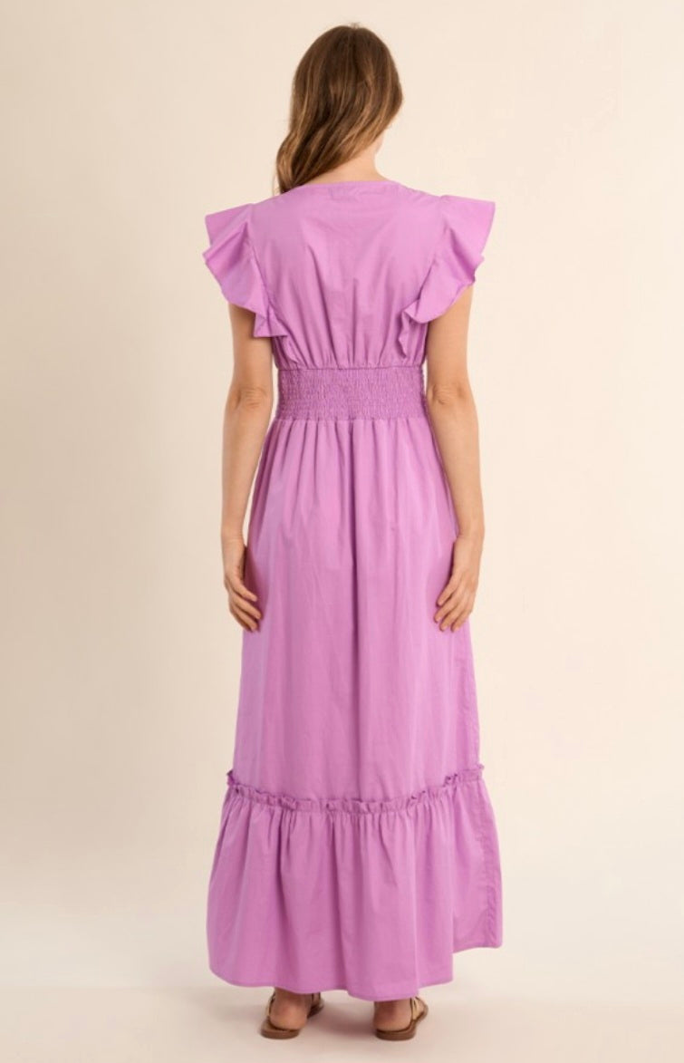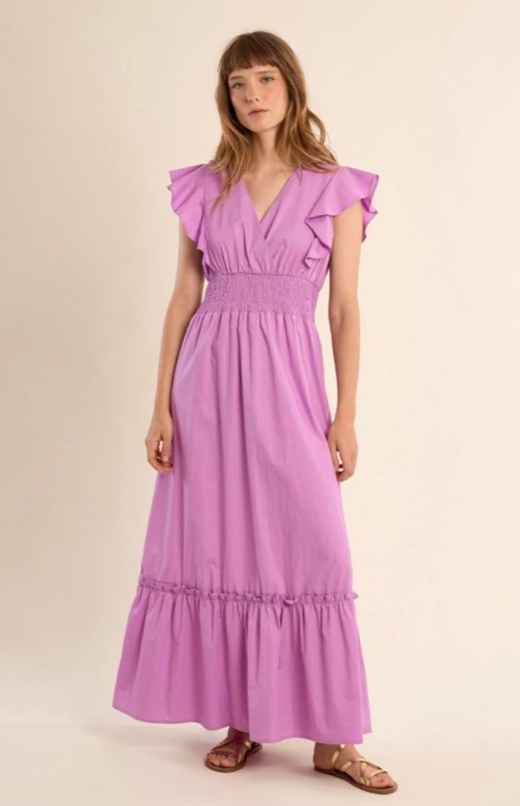 "-Long dress in volume -Short sleeves with ruffles -Criss-cross V-neckline -High waist marked by a smocking band -Flared fit -Wide ruffle on the bottom of the skirt -Length from the shoulder 140cm for a size S"