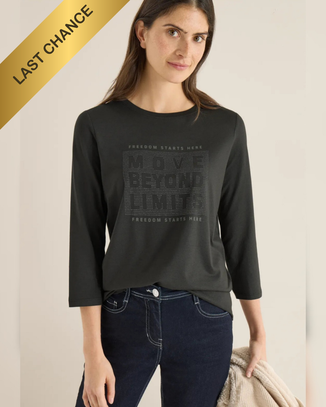 With shimmering lettering on the front, this women's shirt from CECIL makes a fashion statement. The boat neck, side slits, and pure cotton ensure a comfortable feel. An uncomplicated look with a sparkling accent.