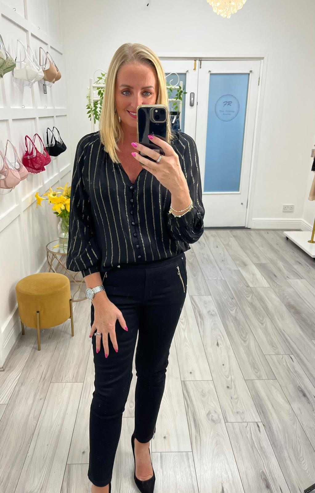 "-Semi-sheer striped shirt -Long sleeves -Tightened and buttoned cuffs -Shirt collar -Patch pockets on the chest -Pearlescent button closure on the middle front -Straight fit -Side length 69cm for a size S"