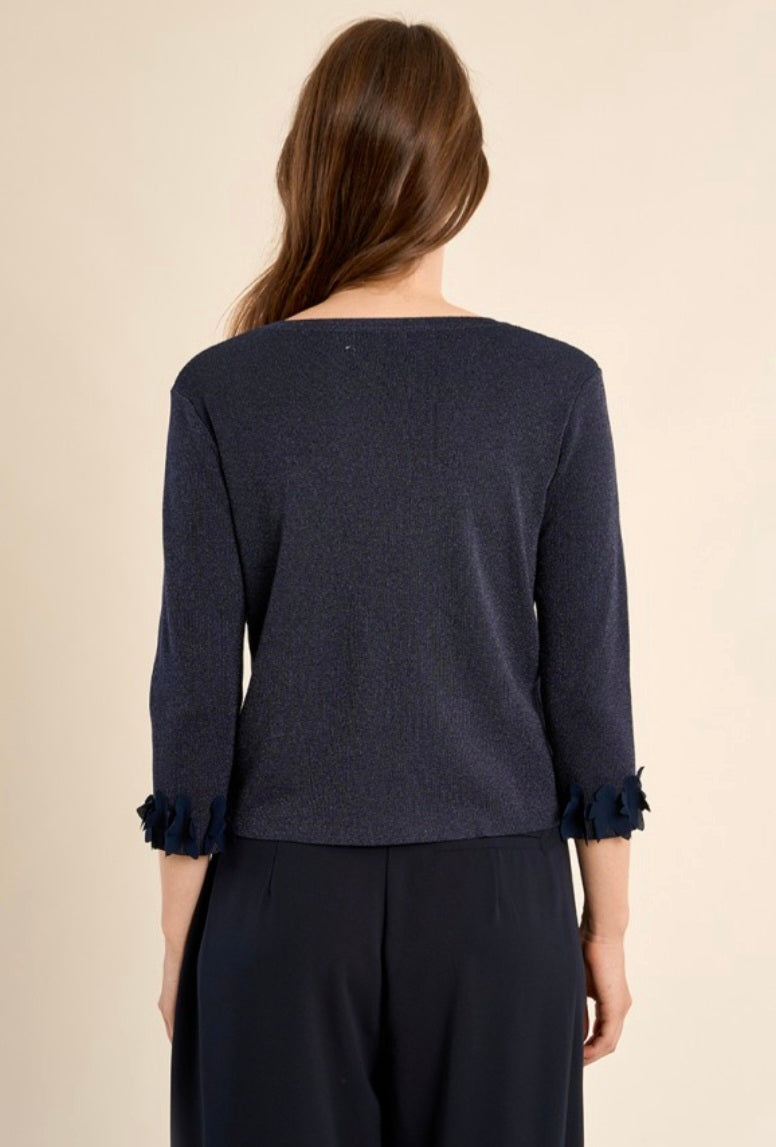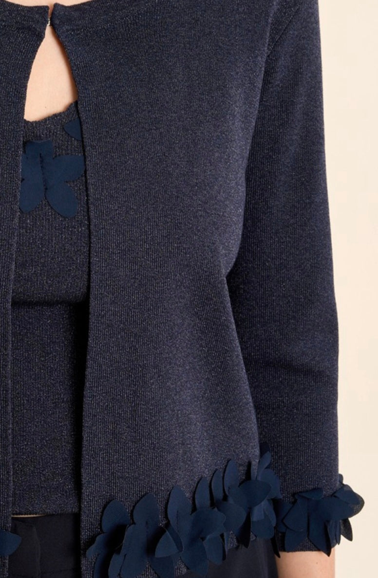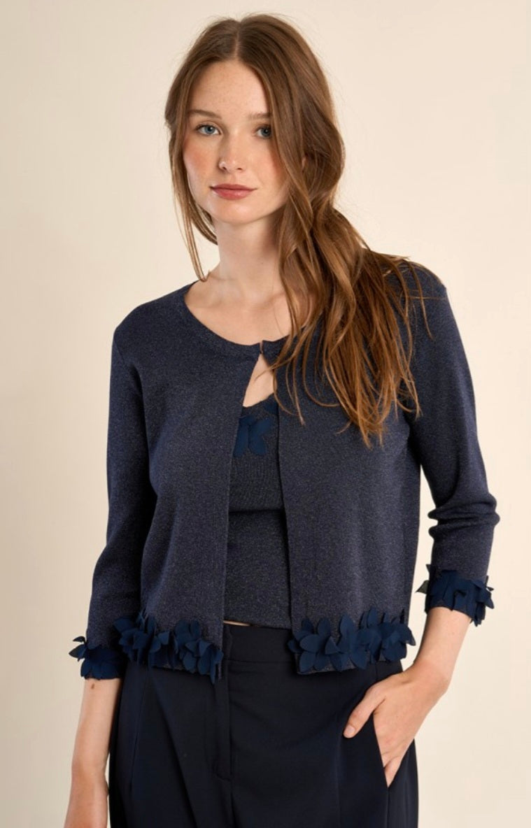 "-Iridescent knit cropped cardigan -3/4 sleeves with fancy finishes -Round neckline -Button closure under the neckline -Straight fit -Fancy flowers -Length from the shoulder 52cm for a size