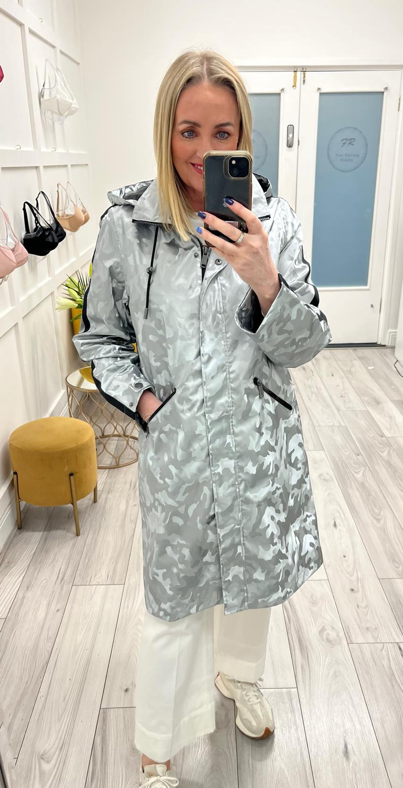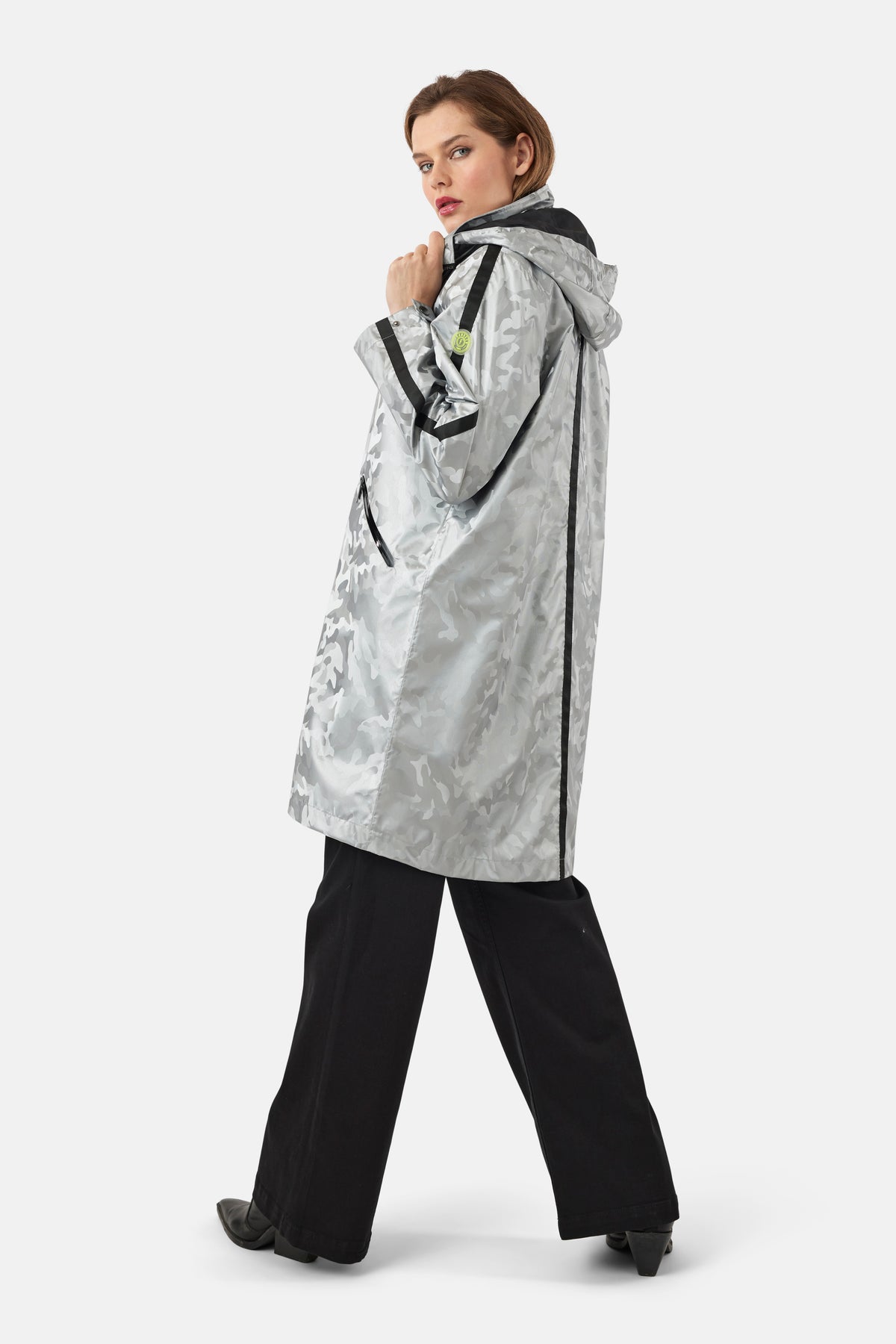 Crafted from lightweight, water-resistant fabric, the raincoat features a sleek silver-grey camouflage pattern that adds a modern edge to classic outerwear. Its knee-length design provides extra coverage, while the tailored silhouette ensures a flattering, feminine fit that moves with you.